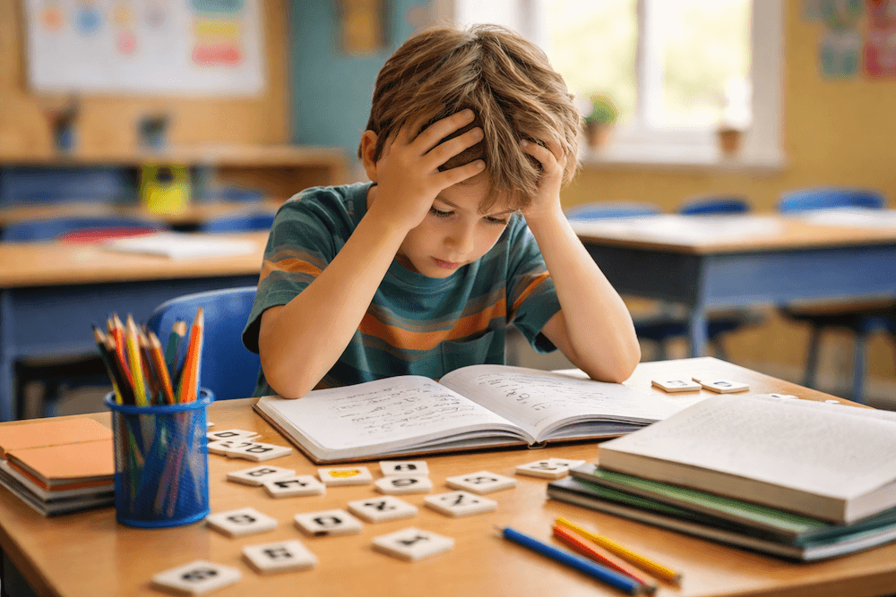 Lecture hésitante avec inversions de lettres (b/d, p/q), erreurs d’orthographe massives non corrigées par la relecture, écriture lente et illisible, difficultés en calcul mental, problèmes de copie au tableau, fatigabilité importante lors des tâches scolaires, évitement des activités d’écriture.
